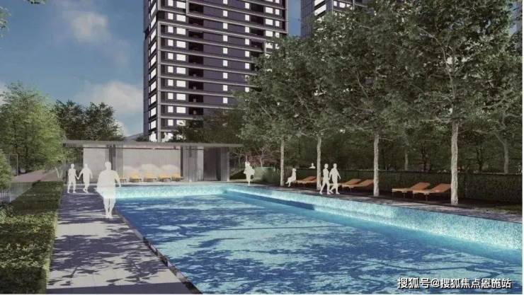宽境中央泳池,夏天时是业主们锻炼玩水的好地方,非夏季则作为镜面观赏池,使泳池能一年四季保证其景观功能性。
