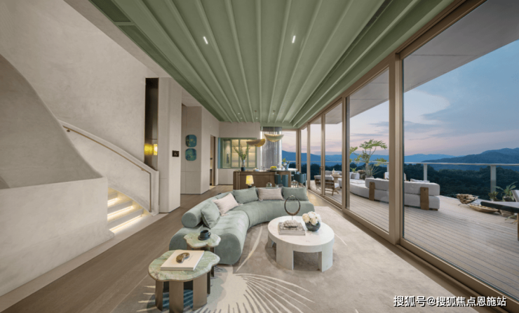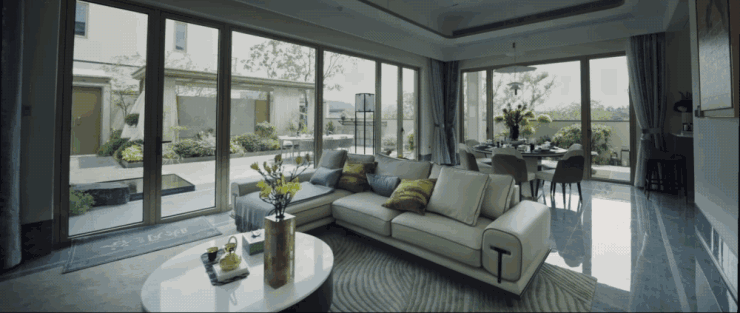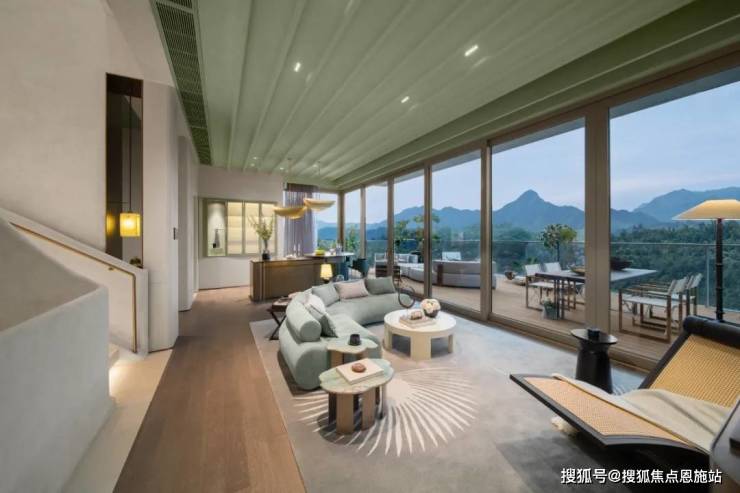 巨幕视野,框景成画。 最大约14.8米Plus版面宽,室内最大程度向自然打开,搭配大片落地窗+层层台地的“剧院式”布局,为户户定制了限量版的清逸山景。