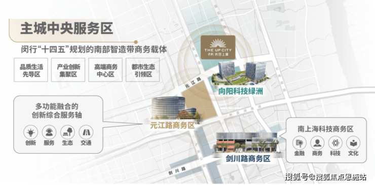 藉由上海南部科创中心与15号线智创聚集建设,依托“3+6+9”闵行TOD示范区和“十四五”双战略及品牌开发商高起点的人居营造,元江片区成为主城科创重策地,汇聚3大国家级产业区、5大科创中心、12大科创园、3000+企业,未来将以科创产业为引擎,入驻100+五百强企业,引进80万全球高智人才,筑就创新、人文、生态高度融合的中央服务区。
