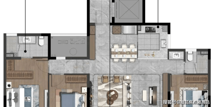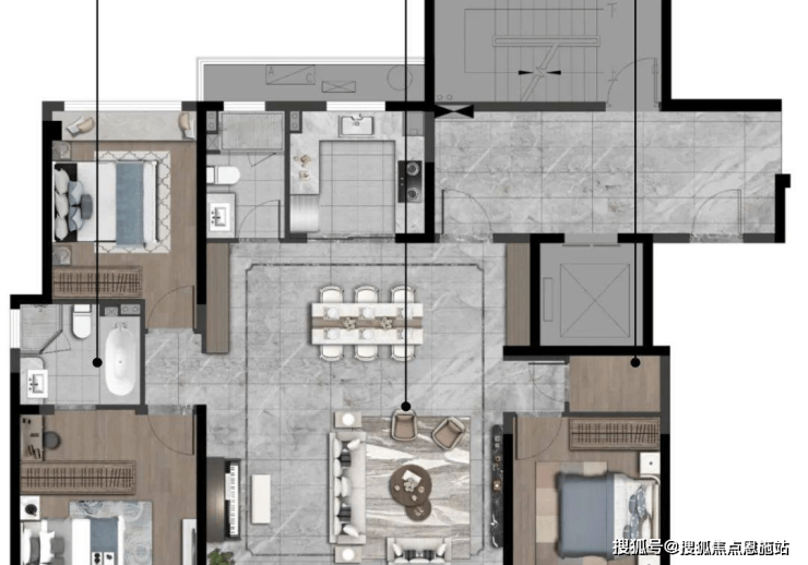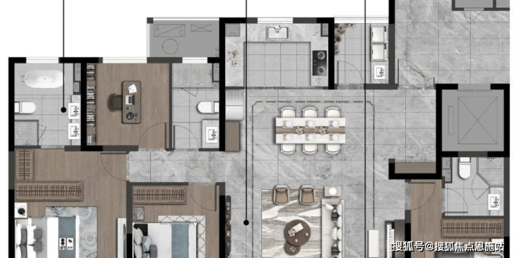 建面约172㎡户型拥有超宽幅尺度的臻景观阳台,成为居家独处时享受阳光的秘密花园。5面宽尺度南向空间+南北双阳台设计+双套房的奢华设计。