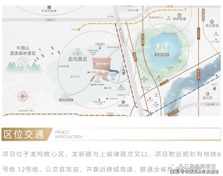 本项目位于主城西湖区龙坞茶镇景区内,被西湖景区、午潮山景区环抱。龙坞茶镇为西湖龙井最大的原产地保护区,70%的西湖龙井产量来源于此,素有“千年茶镇 万担茶乡”之称,也是中国茶主题特色小镇;同时隶属于西湖南线纯低密豪宅板块。
