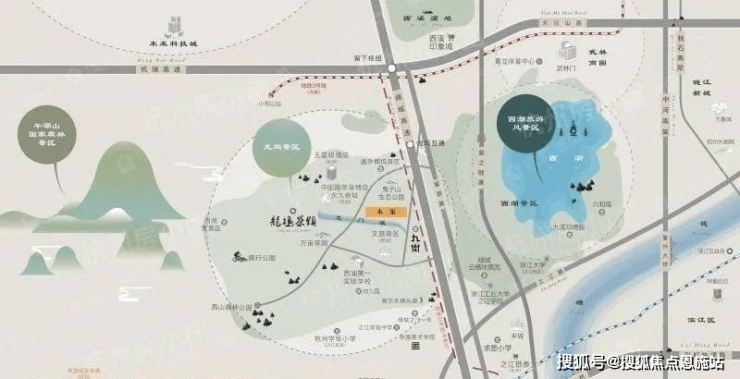 本项目位于主城西湖区龙坞茶镇景区内,被西湖景区、午潮山景区环抱。龙坞茶镇为西湖龙井最大的原产地保护区,70%的西湖龙井产量来源于此,素有“千年茶镇 万担茶乡”之称,也是中国茶主题特色小镇;同时隶属于西湖南线纯低密豪宅板块。