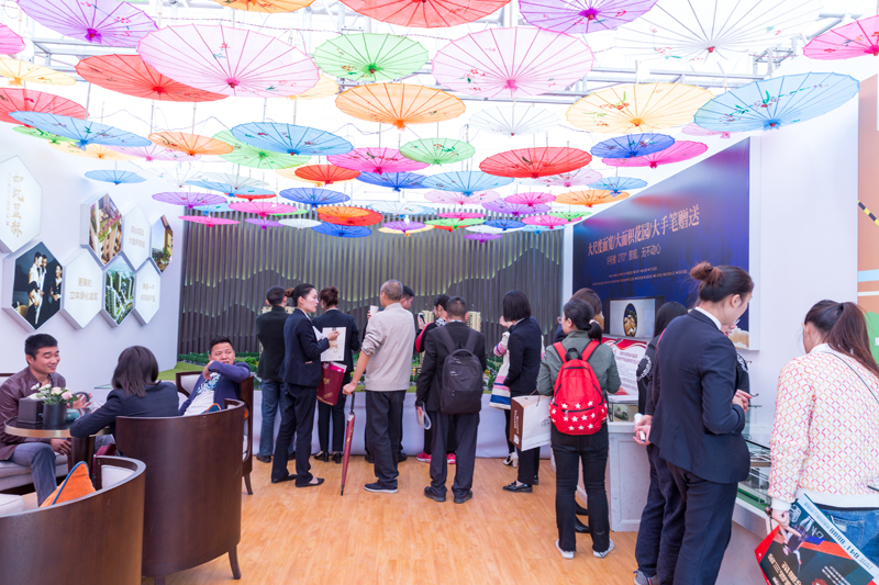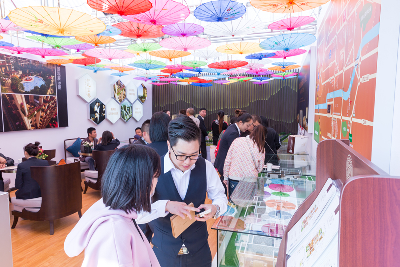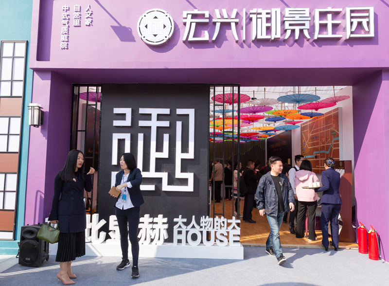 今年房交会宏兴御景庄园以一袭紫色外墙示人,散发出迷人的高贵气质,展厅内顶部是传统的油纸伞,浓郁的中式元素与项目中式庭院的理念不谋而合。