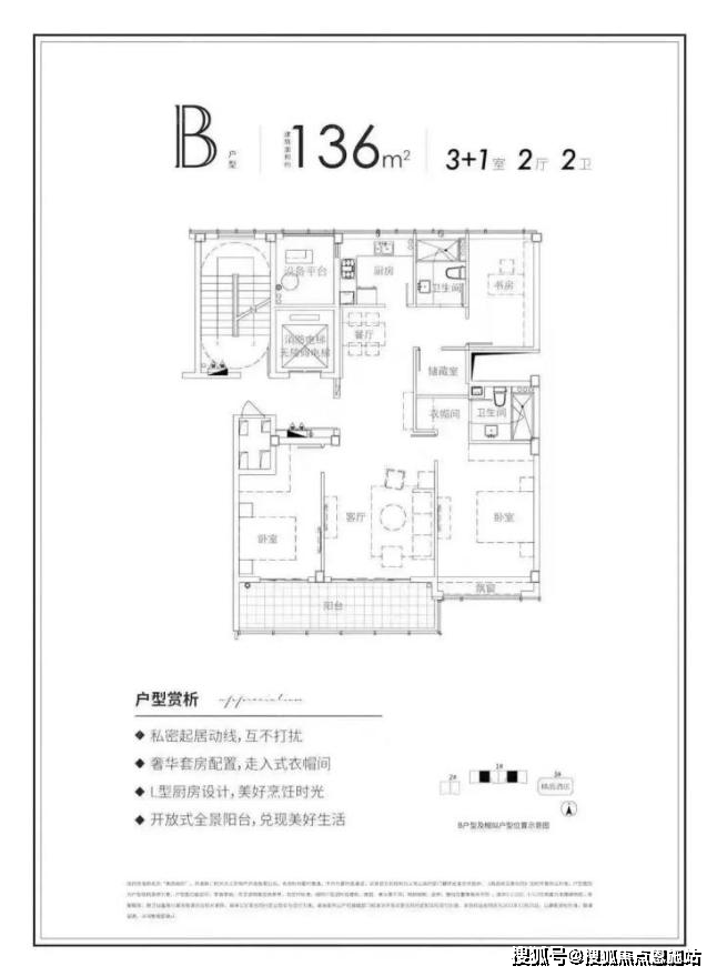 建面约136平方米为最大户型,大三房设计,超宽双连阳台,主卧带独卫、