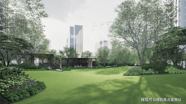 在中央景观上,做了大面积的阳光草坪,配上会客廊架、游园小径、运动热身区、登高面外墙和下凹绿地,满满的大自然氛围感油然而生。