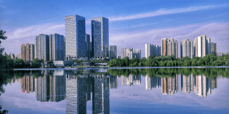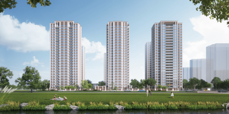 项目结合水岸之境打造城市革新界面,将新中式元素植入现代建筑语系,采用框架式Low-E中空玻璃材质,搭配高比例窗墙比,著写姚家荡时代封面。