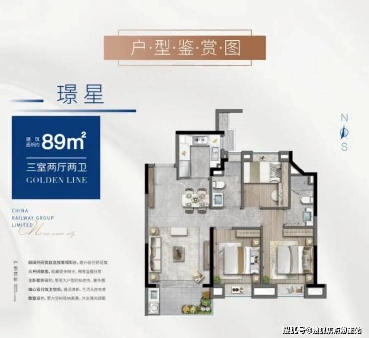 99m²3房2厅2卫高层户型,同样三开间朝南,采光效果极佳;大开间客厅,媲美豪宅的尺度感。主卧套房,步入式衣帽间设计,提升居住舒适度。