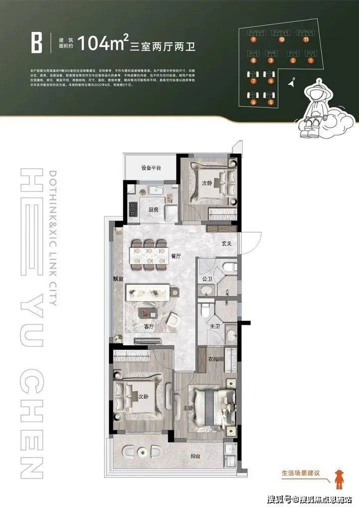 荷禹宸府104㎡边套三室两厅两卫实拍视频:项目三房户型的升级版,分布于4#~7#四幢,边套带来的客厅更为开阔大气,餐客连厅带大飘窗,即时是低楼层也拥有不错的采光;两房朝南,主次卧带双向阳台,6#、7#两幢沿荷禹路同样可以望见城市街景。