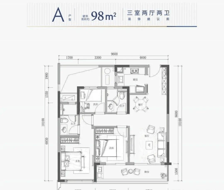 建面约98㎡三房两厅两卫户型,首开最低3成首付仅约39.6万。