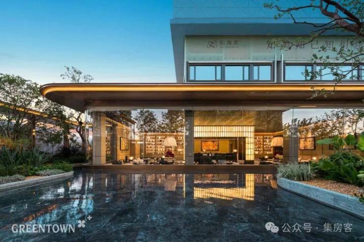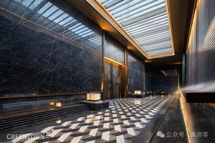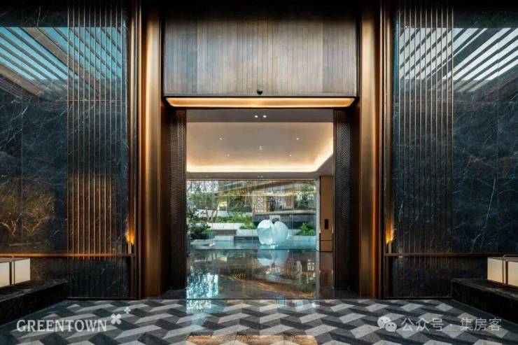 主入口知·云栖,取意西湖十景以"洄游"为理念,超52米跨度的回字形布局,重构传统"四水归堂"空间序列,约2.4米“流光礼宾” 塔冠,如悬浮的美学灯塔,与金色挑檐相映成辉,全封闭式阳台勾勒建筑轮廓,让立面如镜幕般收纳约30公里江岸鎏光!