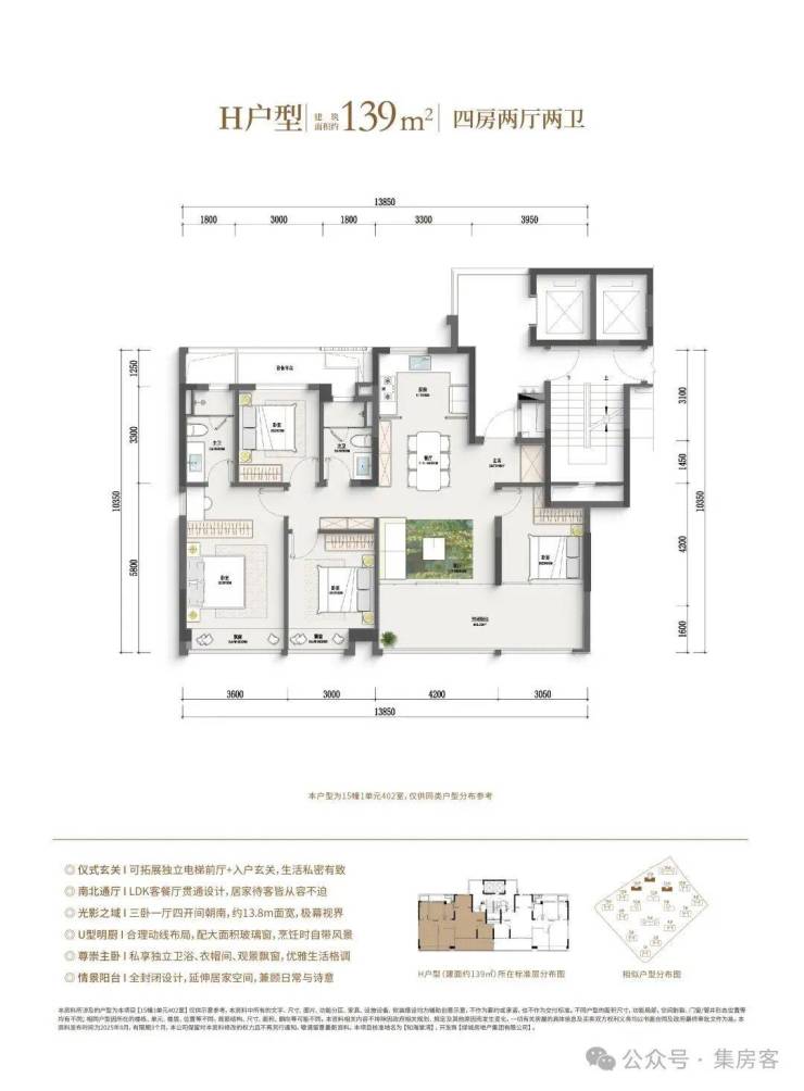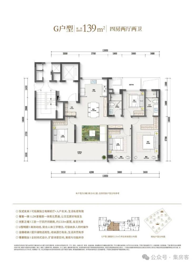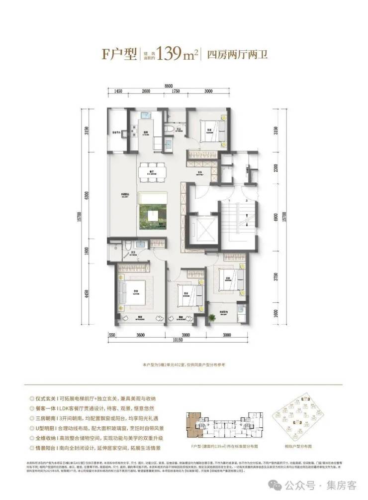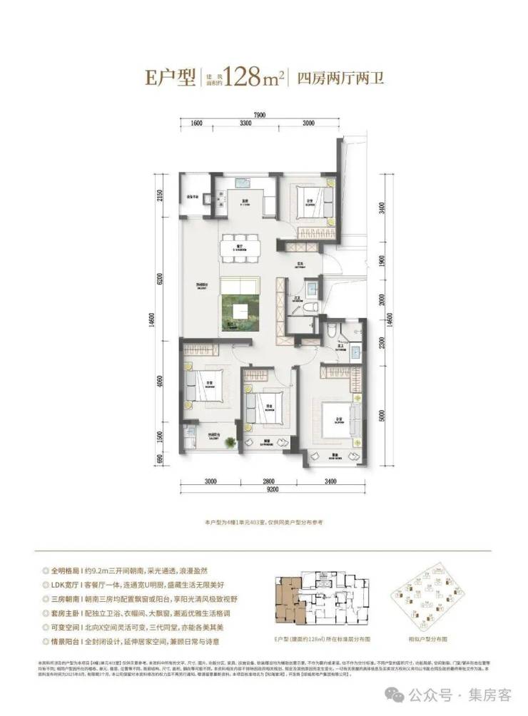 如果预算再多一点,家里人多一点,建面约128㎡边套四房户型,同样也是边厅户型,空间更大,功能性更强,总价相比市面上的139㎡还是亲民了许多。此外,作为板块首个封闭式阳台的住宅项目,还是之江首个全屋五重收纳功能柜子全赠送的项目。