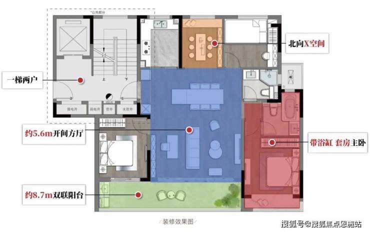 尤其是约8.7米双联跑道式阳台串联约5.6米奢阔方厅,LDKB一体化布局下,视野和采光拉满