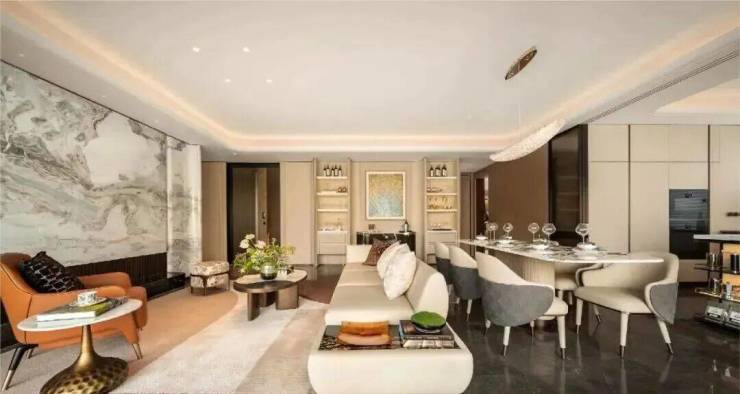 餐厅区域打造了整面墙的 餐边柜 (交付标准),中间是弧形的 芬迪白 奢石背景墙,工艺复杂,视觉效果非常震撼