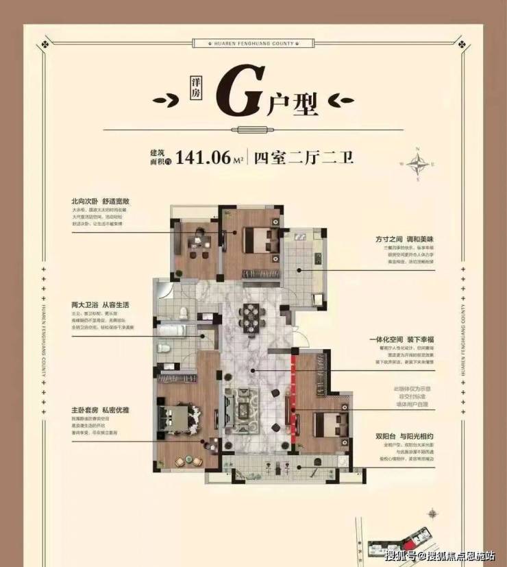 141.06㎡,4室2厅2卫,与上个户型布局基本一致,除了入户位置以及南向次卧稍有变化。