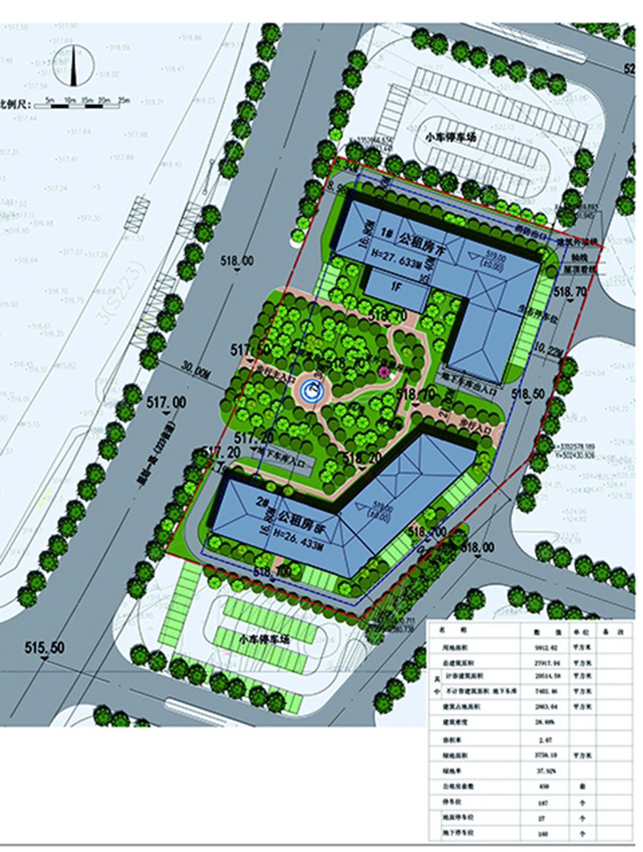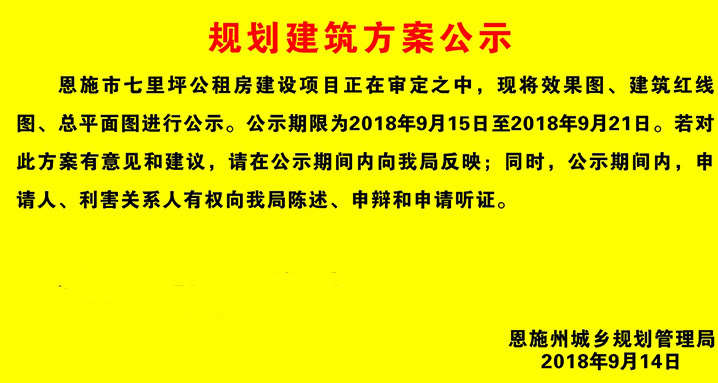 据了解,七里坪公租房项目位于七里坪村、核桃坝村,由恩施市福达产业投资有限公司申请投建,用地面积9842.75平方米,总建筑面积2.7万方,用地性质为居住用地。包括2栋公租房住宅楼,以及体育健身场地、地下停车场等配套设施,其中,停车位182个,地上24个,地下158个,绿地率27%。