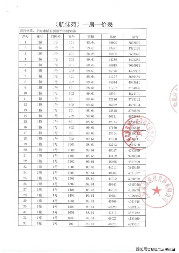 项目一房一价表