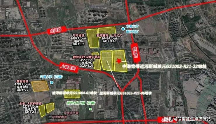 2021年10月12日,运河新城GS1003-R21-22地块出让,作为当天竞价轮数最多的地块,滨江、绿城、大家、西房等一众豪强都视其为囊中之物,最终中海经过36轮竞价以25365元/㎡的楼面价拿下,溢价率6.23。 这就是融信天阳·云澜天第府往东300米、万科·河语光年东南直线350米的中海·河映云集。