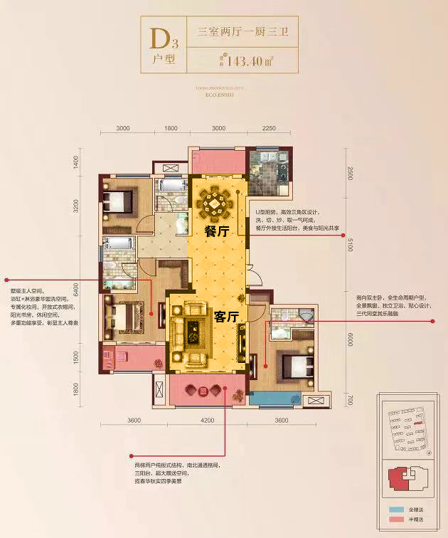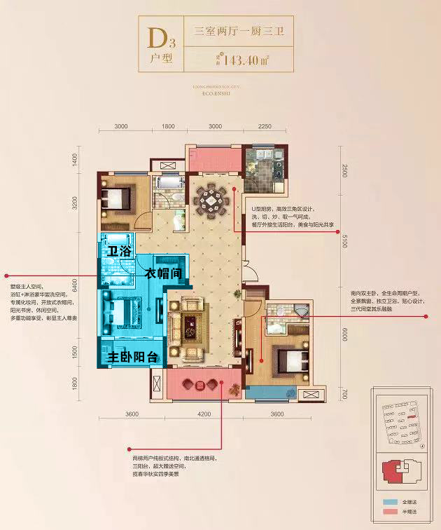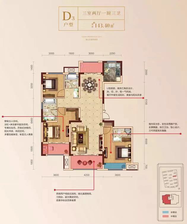 龙凤生态城D3户型、I户型都是套房式主卧设计,集步入式衣帽间、独立卫浴间于一体,不论是功能、尺度都面面俱到,让业主回归优雅随心的生活。