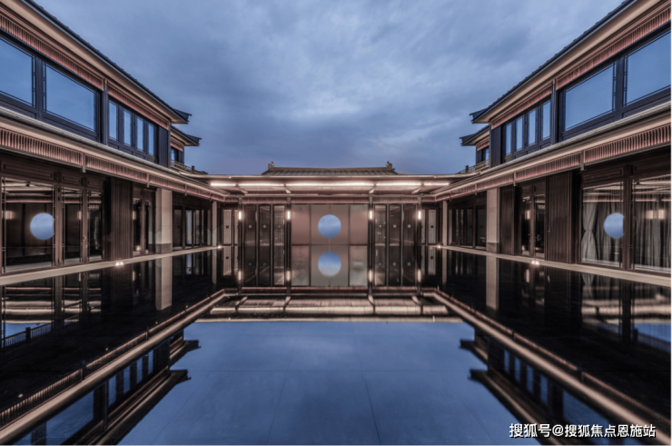 一进门,一个宽阔的水庭便出现在眼前,四周阳光洒落其中,这就是传承生活美好寓意的「四水归堂」。