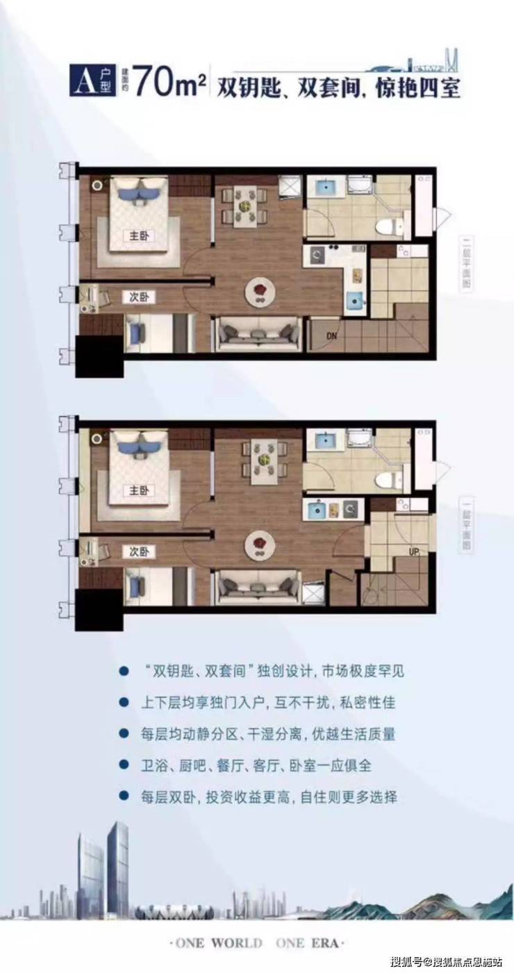 其次山水时代70方户型和大多的双钥匙房源一样,一室之内分为上下两个套间,每个套间均带有两室两厅一卫一厨的格局。主卧面积较大,有更多的收藏空间;靠窗区域设计有书桌和书柜