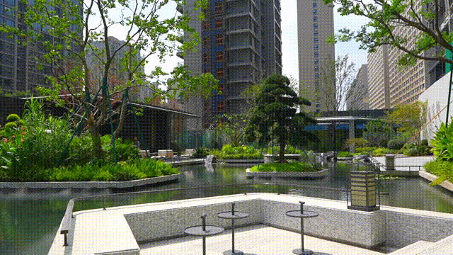 潮映望月府8幢16-26层的高层,采用围合式排布,形成一个内向型的中央主题景观,面积达到约5000方,整体以“一廊三心九园”的规划理念出发,其中的“一园”曲桥风荷,灵感来源于杭州西湖十景之一的曲院风荷,近水平台与中央景观相连,不规则的边界更像是蔚蓝梦幻岛,搭配下沉式休息区,将景观与功能空间巧妙结合。