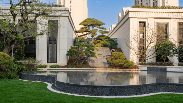 第二,水景池采用挪威蓝珍珠打磨,花坛立面-压顶使用保加利亚沉香米黄,搭配堆坡景观,层次错落。