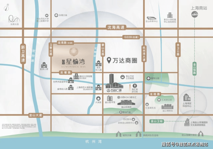 交通方面,「复地·星愉湾」距离金山卫站约4.5km,可直达上海南站;周边更有多条公交线路,在紧邻的万达枢纽站,金山10路、山阳1路、石漕线、朱卫线等十余条公交线路,通达金山全域。