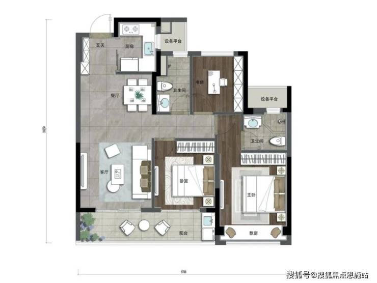 建筑面积约99方的户型也不错,中间套都做到了三开间朝南,横跨两个开间的阳台也很阔绰,还有套房设计的大主卧。