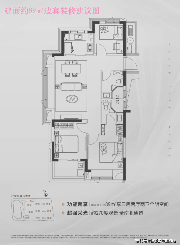建面约89㎡的边套户型,三房两厅两卫,在传统中间套的户型上再创造,小户型做到了约270度采光体验,超越原有体感空间大小,畅享阳光生活。