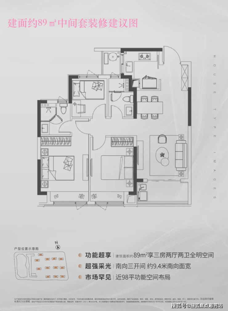 建面约89㎡中间套户型,三房两厅两卫,南向三开间,约9.4米的南向面宽,优秀的空间设计表现,媲美市面上建面约95㎡以上的三房产品。