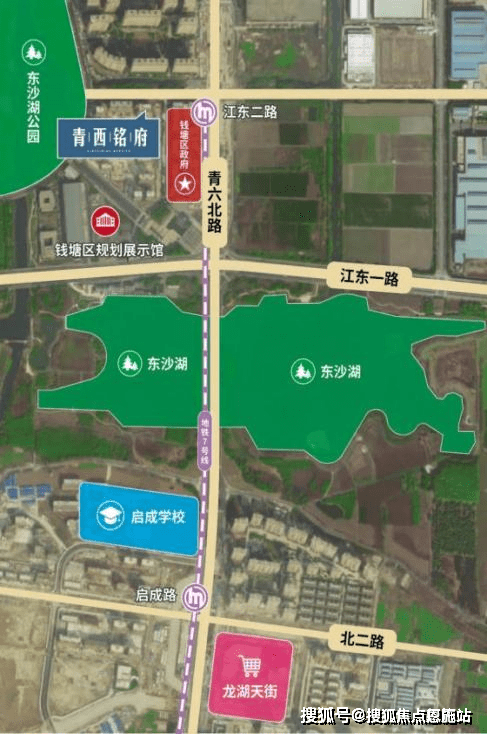 南至卓越星央悦府项目,西至青西路,北至江东二路,地铁7号线江东二路站位于项目东侧约100米。