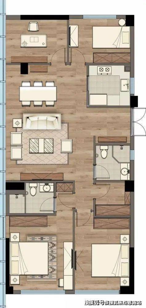 每一个户型都凝聚了开放商的匠心巧思。99㎡户型做到了三开间朝南的黄金格局,9.7m超大瞰景面宽。每个清晨被阳光叫醒,江风穿堂而入,满满的幸福感。