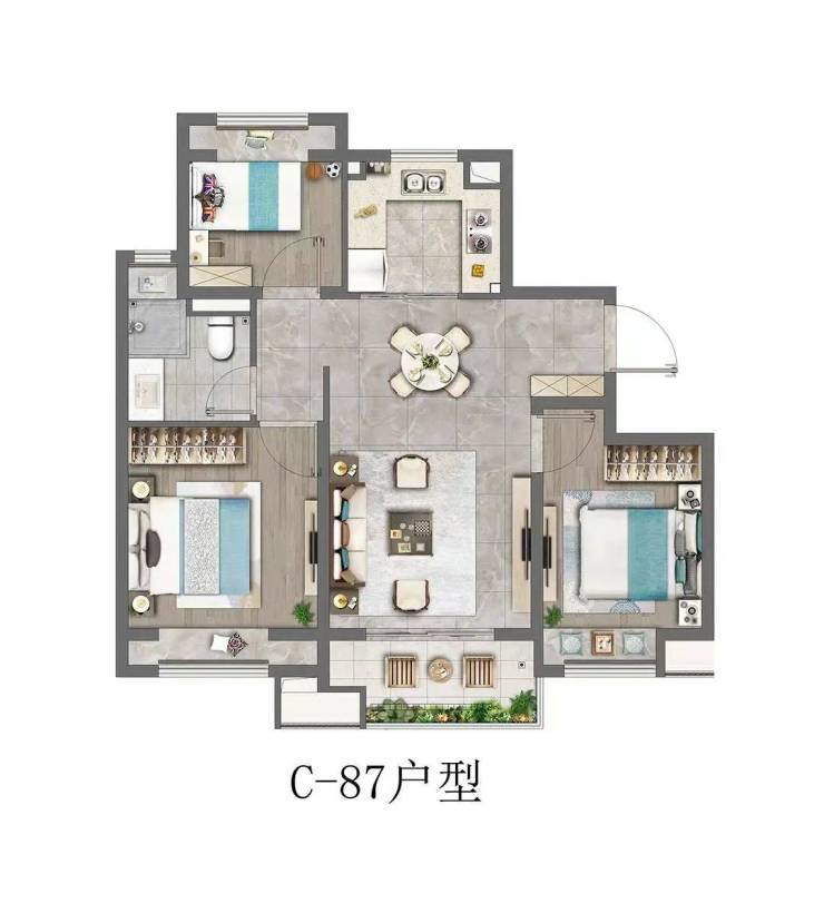 建面约87㎡三房户型,可谓云湖壹号的“头牌明星”。三开间朝南,南北通透,所有卧室均带飘窗,不管是采光、通风、还是视野,这个户型都无懈可击。