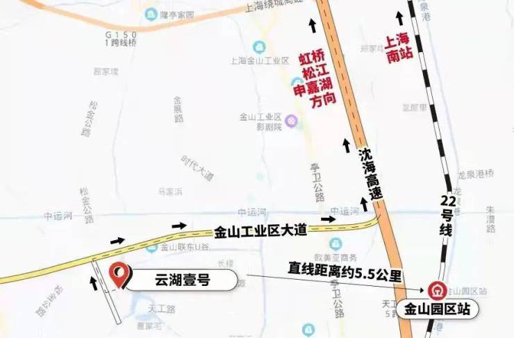 交通方面,除了上文提到的南枫线外,项目离轨交22号线金山园区站直线距离约5.5km,公交卡直接上车,可以去往上海南站,再坐三站地铁即到徐家汇。注:从上海南站,坐轨交半小时左右的片区房价,金山算最洼地,所以在南站或徐汇CBD附近的白领,有不少到金山购房的。
