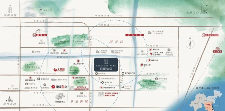 项目周边学府林立,2公里范围内有浙师大附属嘉善实验学校、上海理工大学附属学校、国开幼儿园等