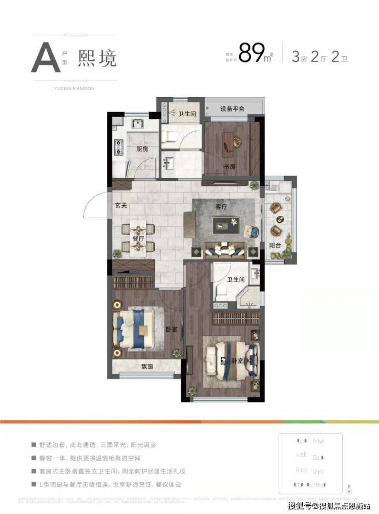 89方B户型:3室2厅2卫,含赠送套内面积75.8方,含赠送得房率85%。