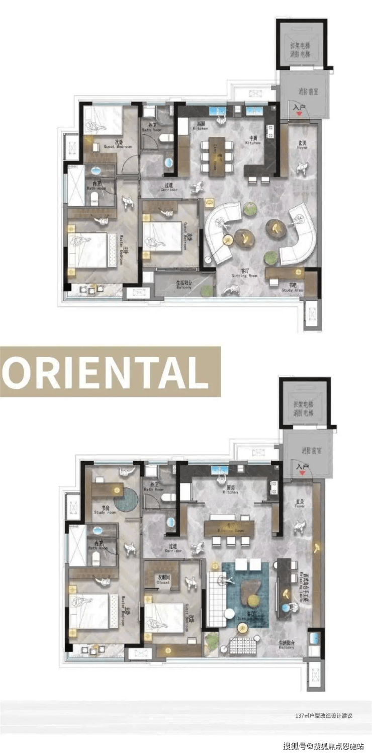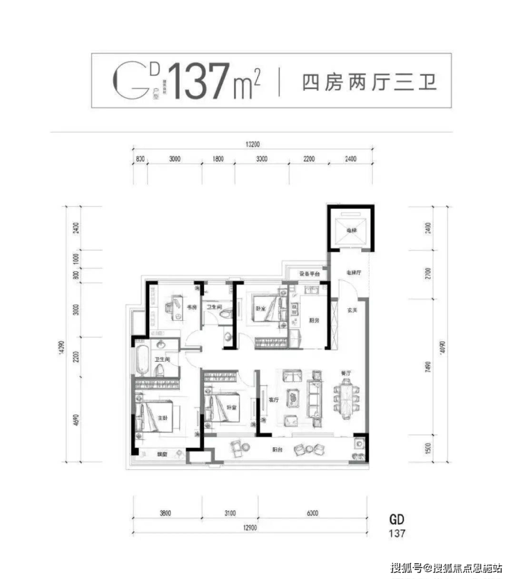 奢境不止于此, 建面约137㎡户型,更是在此基础上不断拉大空间骨架,同样的3+1开间户型,客厅面宽约6米,整体面宽约12.9米,奢阔的格局,嫣然一副大家气魄。
