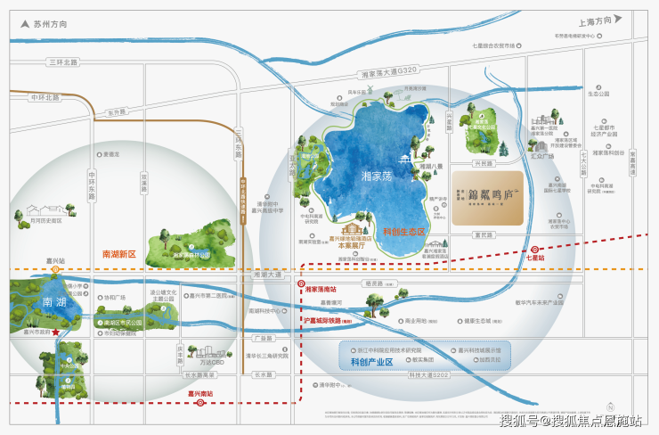 锦粼鸣庐位于嘉兴市南湖区湘家荡AAAA级度假景区,富民路与兴星路交汇处,毗邻湘家荡湖泊,打造湖畔住宅。