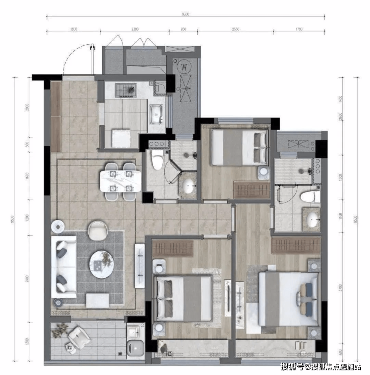 而启岸城建面约89方的3室2厅2卫中间套,南面一字型阳台+双飘窗,总开间达约9.3米,这尺度与很多大面积的改善户型不相上下。
