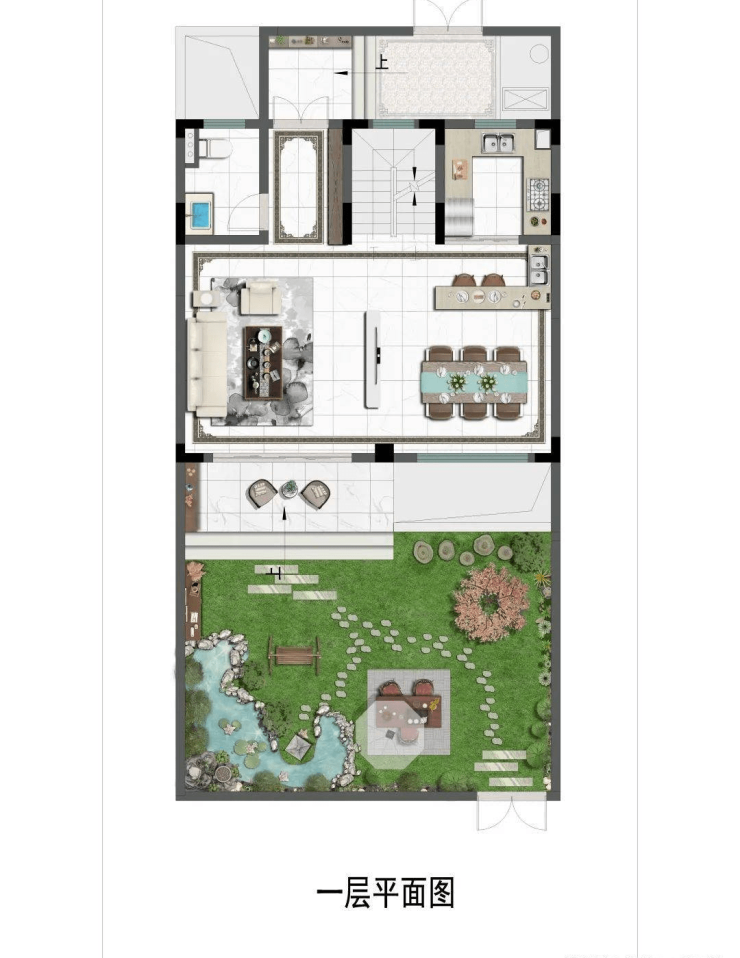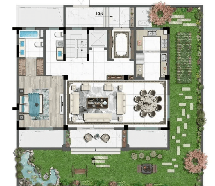 穿过南入户花园的小道,沉浸在花园里的宽绰一层,主要布局了餐客大横厅、中西双厨、以及套房主卧。