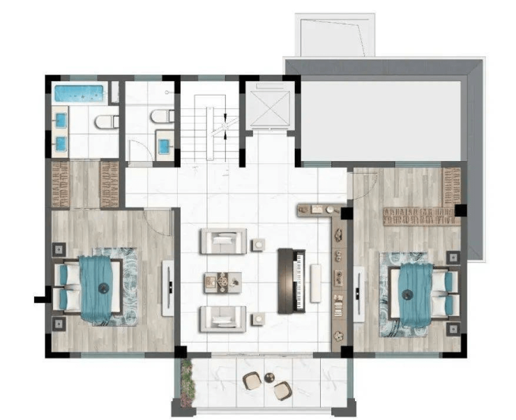 两侧是两个尺度充裕的卧室,一个带独立卫生间,一个带全明的衣帽间。