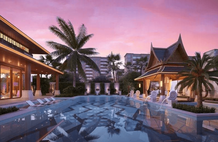 东南亚风情低密大盘、全域人车分流设,自带约2800m²铂金度假会所、约300m²户外镜面泳池、162-340㎡地上三层正统别墅、有花园有露台……