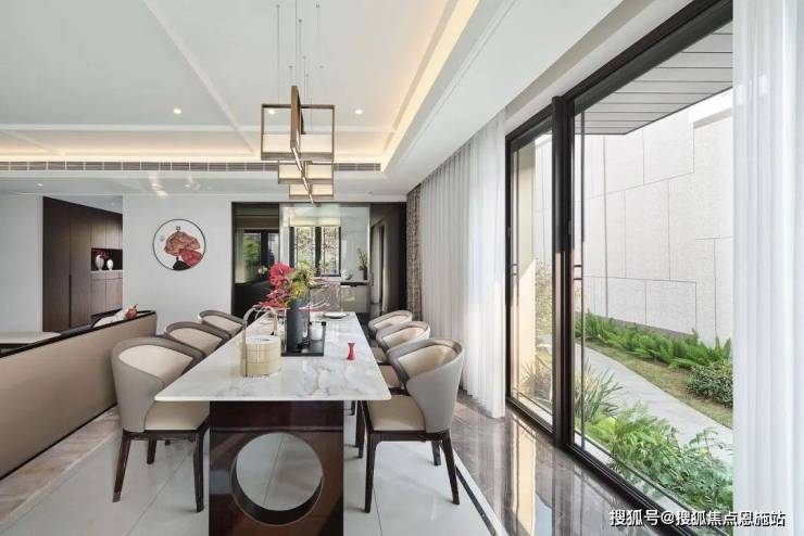 建面约259㎡边套下叠的客餐厅面积占了单层近一半, L型采光大客厅,连北向的楼梯井都做到了全明,阳台外的屋檐之下自然地形成了一个灰空间,通过与落地窗、绿篱的围合,形成私享的院落。