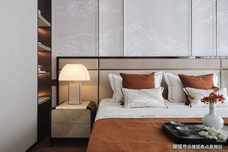 主卧室延续了客餐厅的雅奢韵味,床背景采用细腻的艺术壁纸,展现出一幅中式山景。软装上,将东方特有的符号融入家具、灯具等的细节,床则采用了宽靠背具有中式线条感的特别设计,大气又兼具东方特色。艺术品的陈设上也与客餐厅遥相呼应,运用山景的静谧,营造出卧室的悠然自得。