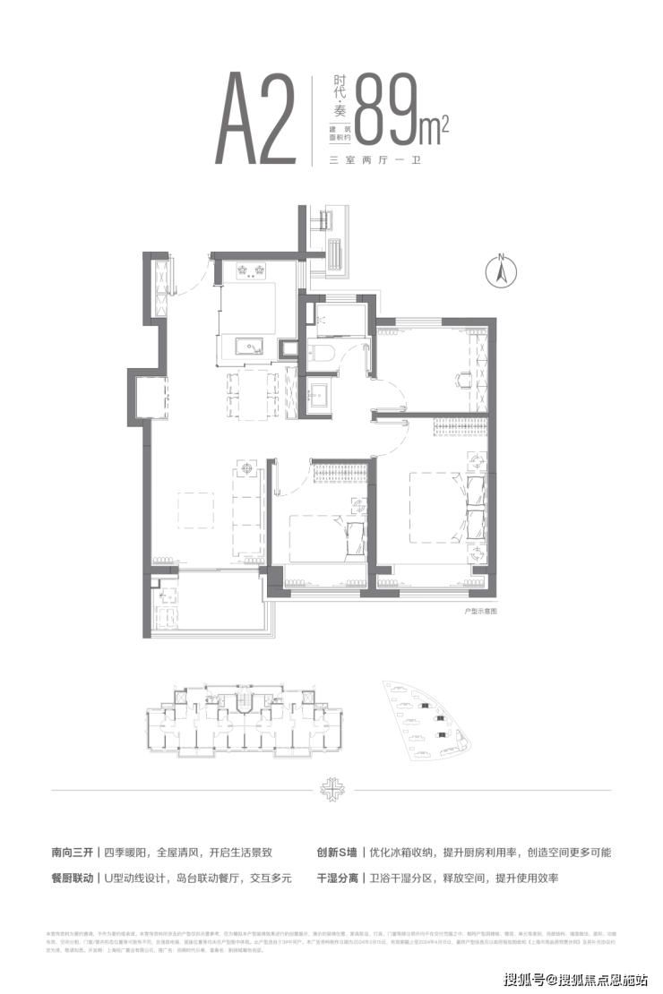 建面约89m²三房两厅一卫户型,LDKB一体化设计,南向三开间布局,全明空间设计。让四季流转于生活之中,用自然营造生活的惬意。