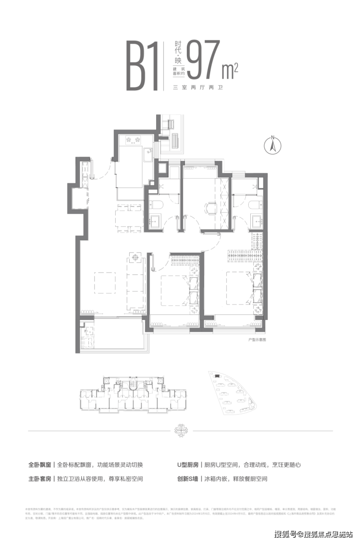 面约97m²三房两厅两卫户型,全卧+主卫飘窗配置,并通过飞机户型空间布局,提升了空间的使用效率,让温情在自然中自然发生。