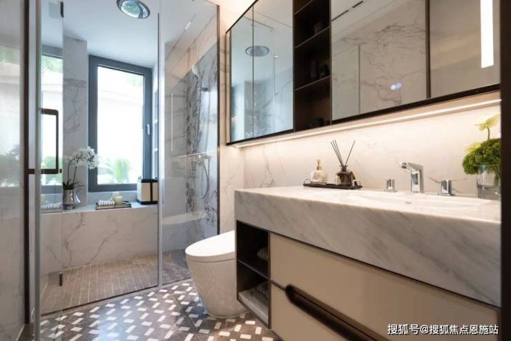卫浴洁具选用了全套的高仪产品(或同等品牌,以实际交付为准):独立式全智能马桶、台盆、三孔调节龙头、恒温顶喷花洒等等......智能镜柜更是延伸至马桶背后墙面,扩容收纳空间相当人性化!