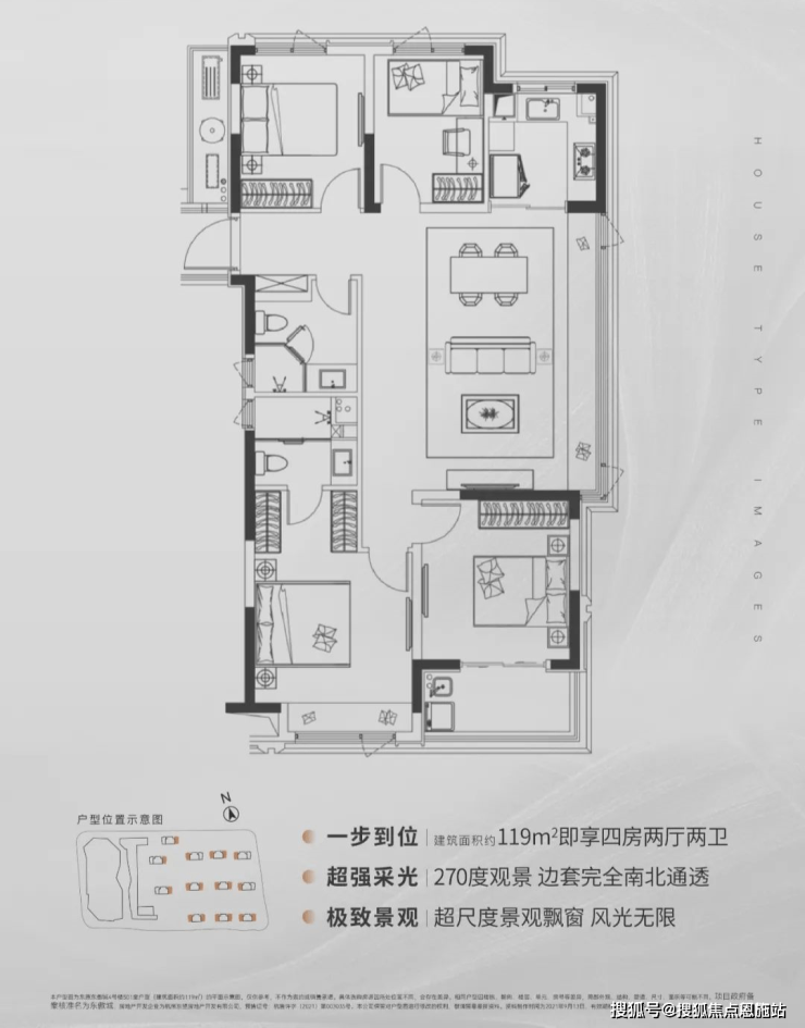 建面约119㎡户型将空间做到了极致,四房两厅两卫,在保证居家功能的安享之外,更是通过超尺度的转角景观飘窗,同时270°全明观景视野,采光效果锦上添花,边套产品更是做到了南北完全通透。