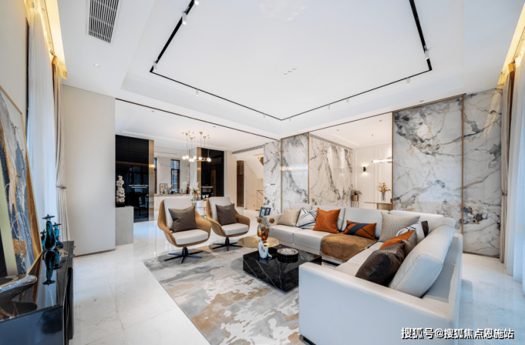一楼会客区,南面开间约11.1米,框画入室;北面是餐厅厨房,透过窗外可以看到北花园。西面带约7㎡阳台,客厅空间无限延展。