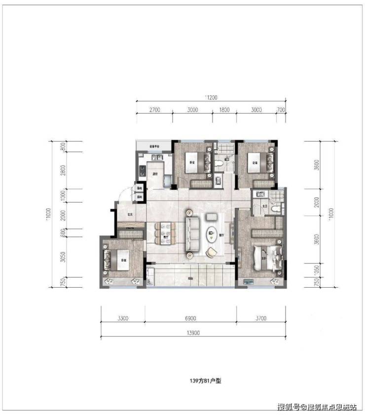 约127㎡ 经典四叶草户型,全明通透,4个功能间分别位于四角,正好契合了当下注重隐私的居住潮流。